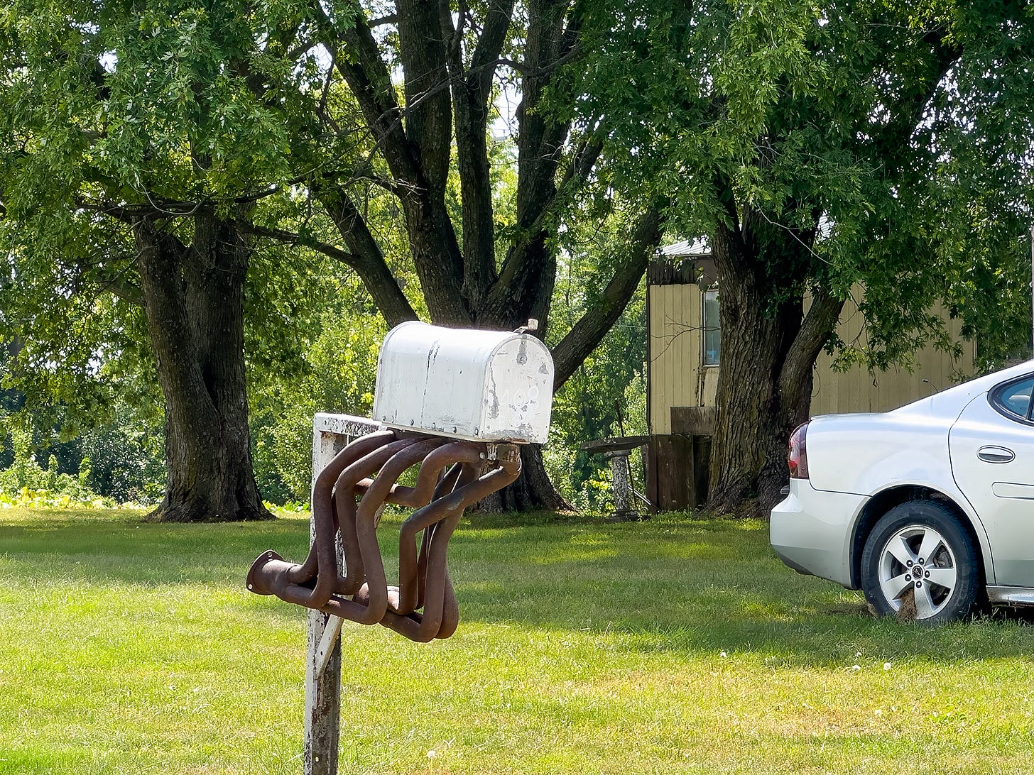 MAP APPS NEVER MENTION THINGS LIKE THIS or how to get there on the back roads. My 2022 Rand McNally Road Atlas, however, clearly shows the Villisca Axe Murder House1 in the tiniest of fine print next to the town on page 38. I first noticed the reference on another trip I took in 2023. After turning off the main highway to Villisca that September, I followed the arrow on a shiny white sign all the way to the other end of town and never spotted the place. Frustrated, I decided to circumnavigate Villisca (population 1,099) to intuit its location from the evil vibes, but all I found was the “Bitchin’ Rusty Hole Auto Restoration Garage,” remarkable in itself. The image below is from the house across the street. That has to be the proprietor’s mailbox. I like the yard and know what warm humid breezes would feel like sitting underneath the trees.