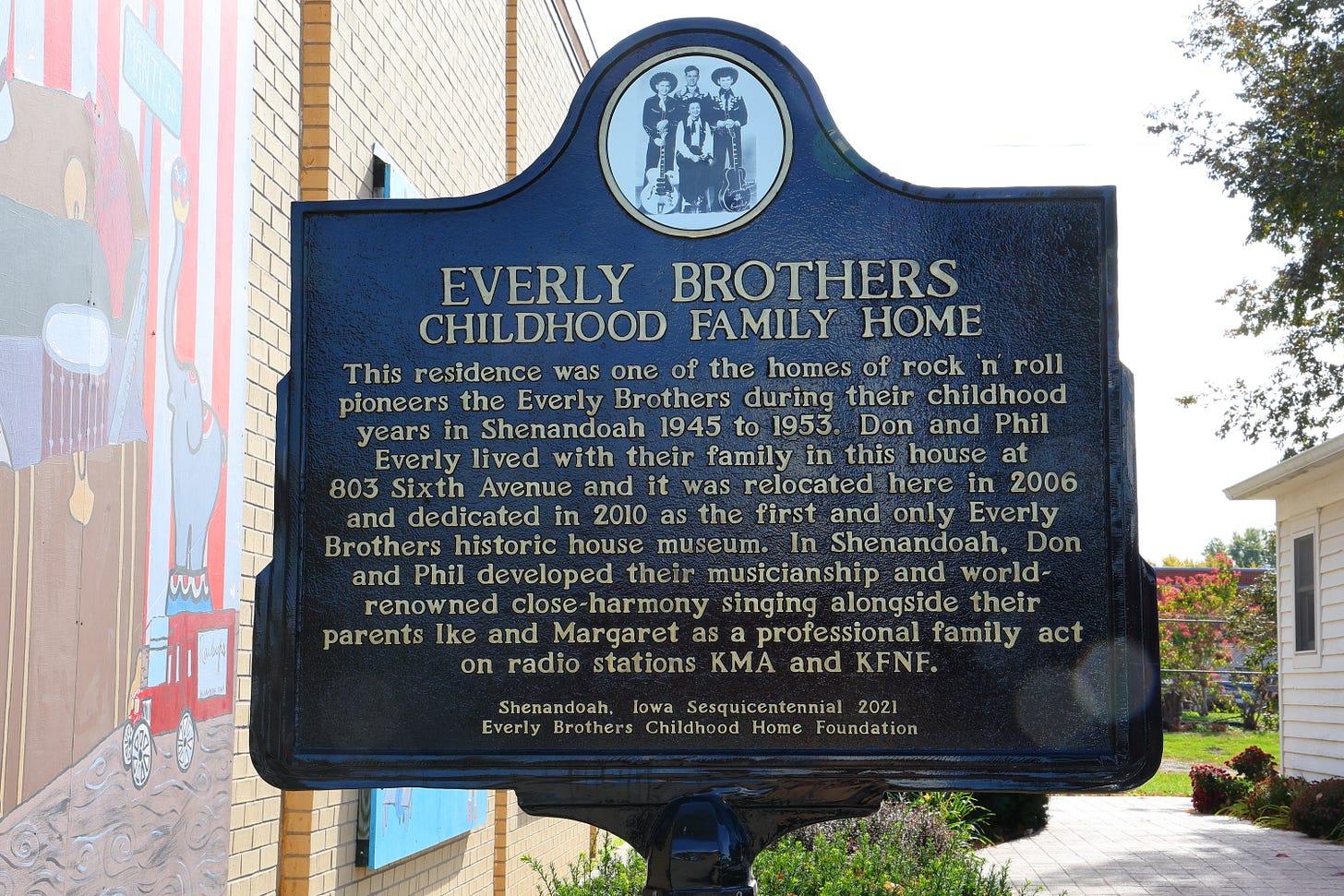 On the second day of my trip out I made a point to go through Shenandoah, Iowa because I’d read that the Everly Brothers grew up there. This surprised me because I thought they came from Knoxville, Tennessee.6 Don was actually born in Brownie, Kentucky on February 1, 1937 and Phil in Chicago on January 19, 1939. I was a huge Everly Brothers fan and “Wake Up Little Susie” became a big hit around the first time I ever kissed a girl. I had a vague notion of the trouble mentioned in the song and didn’t know what the fuss was all about, but I’d just been to a seventh grade sock hop at Rhein-Main Air Force Base at Frankfurt, Germany and danced all night with Rae Ann Hollingsworth, more than once to “Wake Up, Little Susie.” I walked her home afterwards, kissed her in the moonlight, and never saw her again.7 Fast forward 68 years and I was following another sign, this one for the “Everly Brothers Childhood Family Home” in downtown Shenandoah, somehow got lost, and the same thing happened.